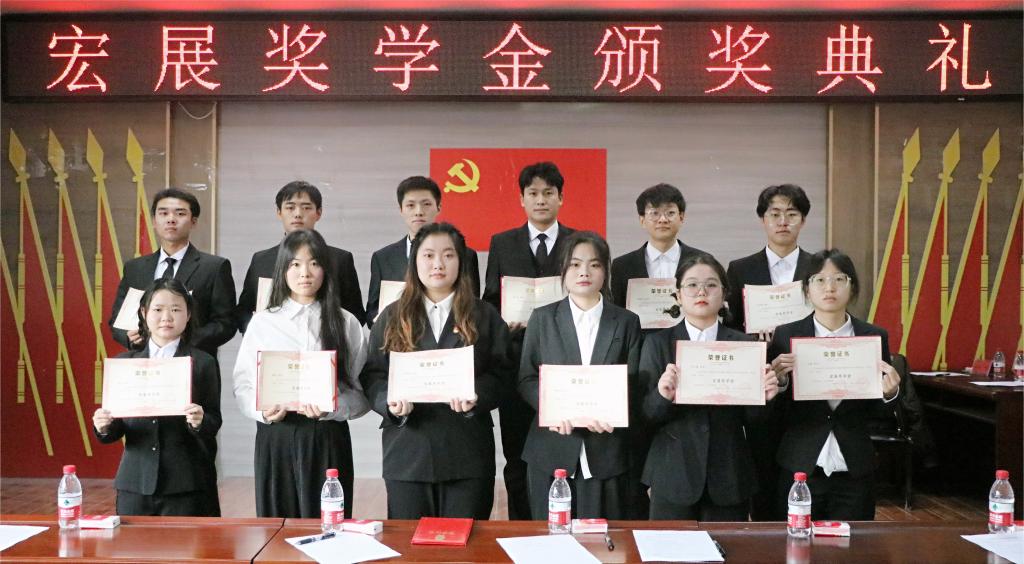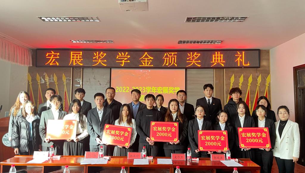 随后,魏晓柳副书记宣读了获奖学生名单,各位领导颁发荣誉证书和奖金。紧接着,获奖学生代表蒋伟文上台发表获奖感言,对学校、学院、公司和老师们的辛勤培育表示感谢,对自己做了新的要求,今后,这份荣誉将激励自己,坚定理想信念,勇敢面对未来。新疆天山宏展牧业有限公司工作人员对公司的架构、文化、福利待遇等多方面做了介绍和宣传,希望有更多的同学进入企业,充实自我,实现理想抱负,最后,全体人员合影留念。