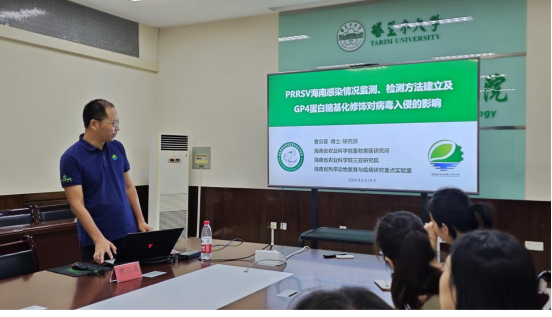 曹宗喜研究员以《PRRSV海南感染情况监测、检测方法建立及GP4蛋白糖基化修饰对病毒入侵的影响》为题,介绍了研究所围绕五指山猪进行的研究,对海南省近年来猪病的流行情况,尤其是PRRSV的感染情况、检测方法的建立以及GP4蛋白糖基化修饰对病毒入侵的影响进行了系统讲述。