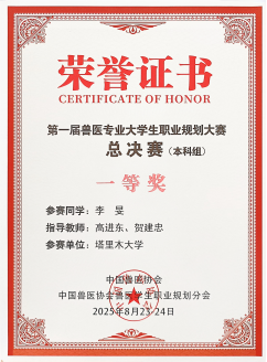 高进东、贺建忠老师指导的2021级动物医学本科生李旻,凭借出色表现斩获一等奖。此前,2023级动物医学专业本科生张照熙同学在初赛中获得优秀奖。