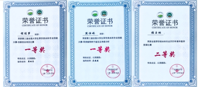 草业科学专业代表队,凭借扎实的专业知识、精湛的实践技能和出色的团队协作,荣获单项比赛一等奖2项(席琳乔老师、屈媛媛老师指导)、二等奖6项(冯斌老师、张玉琳老师指导),最终斩获团体二等奖。同时,在全国草学类本科专业2025年青年教师授课比赛中,张玉琳老师荣获二等奖。充分展现了51大赛