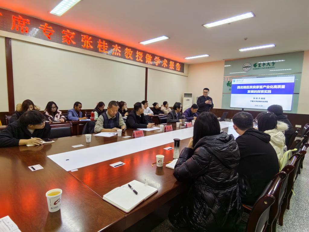 下午,动科楼214会议室张桂杰教授围绕“西北地区优良家畜产业化高质量发展的探索实践”宁夏滩羊高效生产及饲草料高值生物化利用等内容进行了深入讲解,阐述了相关研究成果及前沿观点,对助推西北地区优良家畜产业化高质量发展提供了良好示范,加深了师生们对畜牧业高质量发展核心问题的了解,也为适合南疆畜牧业科学研究和成果转化提供了宝贵思路。参会人员认真聆听、详细记录,并在交流环节积极提问、热烈讨论,现场学术氛围浓厚。学术报告由井波院长主持,畜牧学科相关教师和研究生参加。