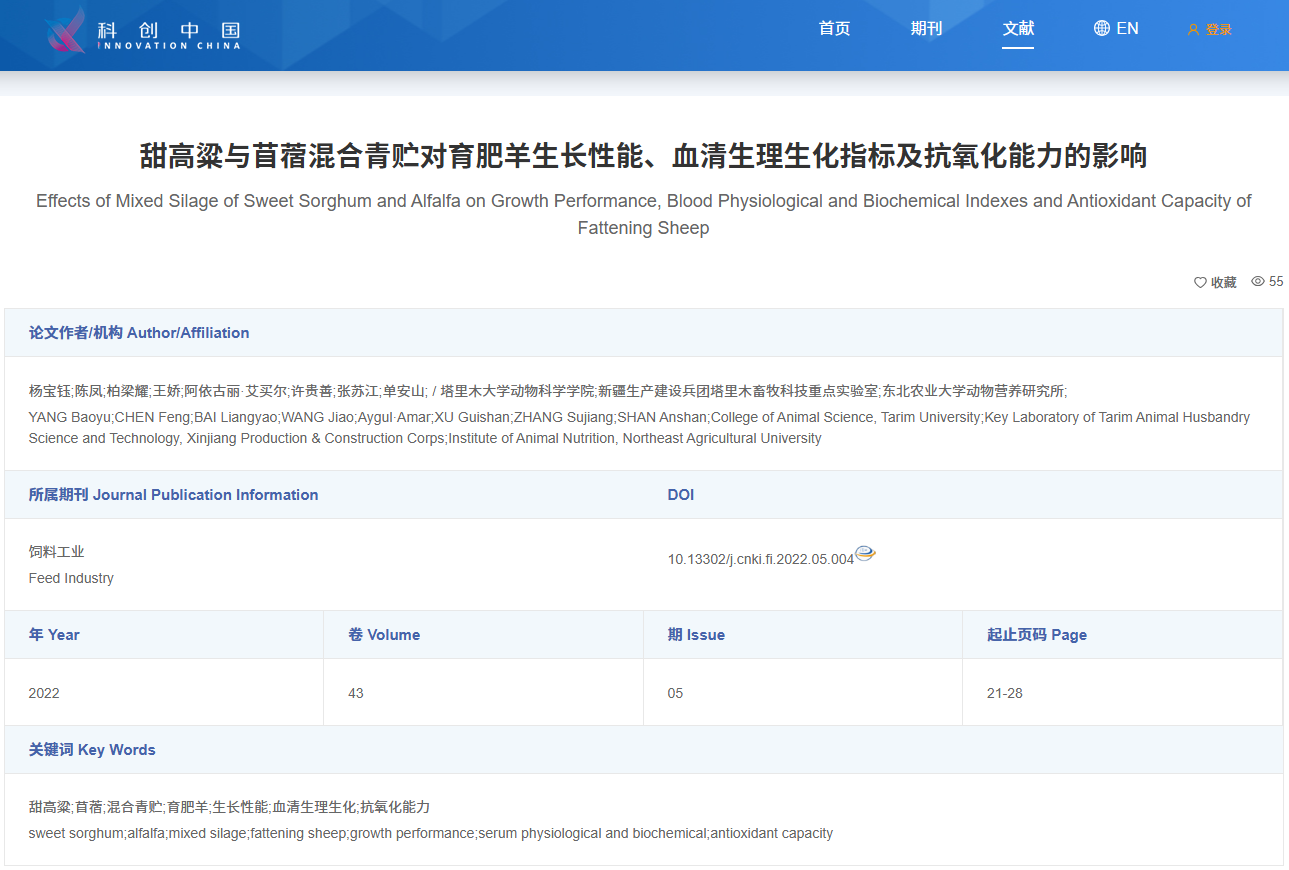 研究生杨宝钰(第一作者)、张苏江教授(通讯作者)等人2022年发表在《饲料工业》的学术论文《甜高粱与苜蓿混合青贮对育肥羊生长性能、血清生理生化指标及抗氧化能力的影响》成功入选,并已正式在“科创中国”网站上线发布。文献信息详见(//castsycb.cbpt.cnki.net/#/article-detail?id=FEED202205004)。
