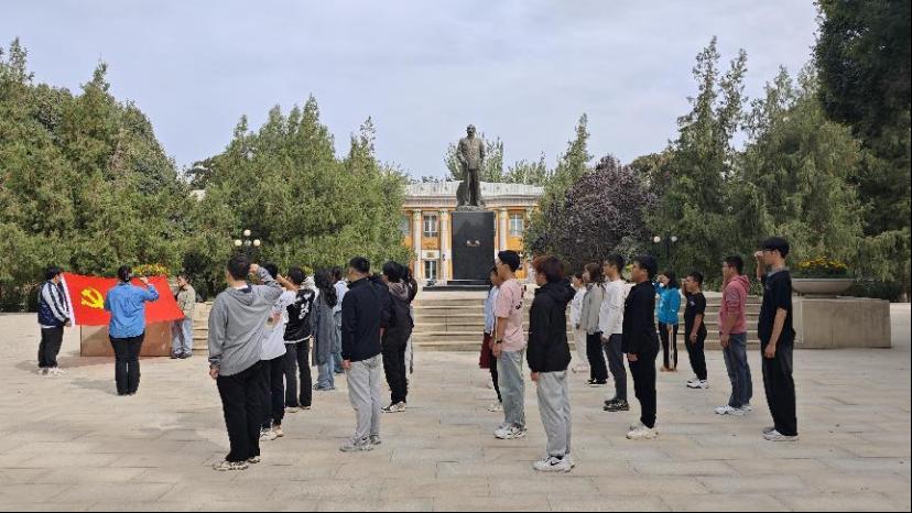红色文化广场,2024级研究生党员在党旗前庄严肃立,由研究生支部宣传委员苏卉欣同志领誓,重温入党誓词。