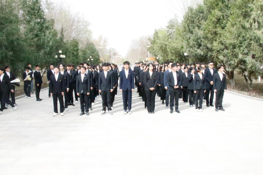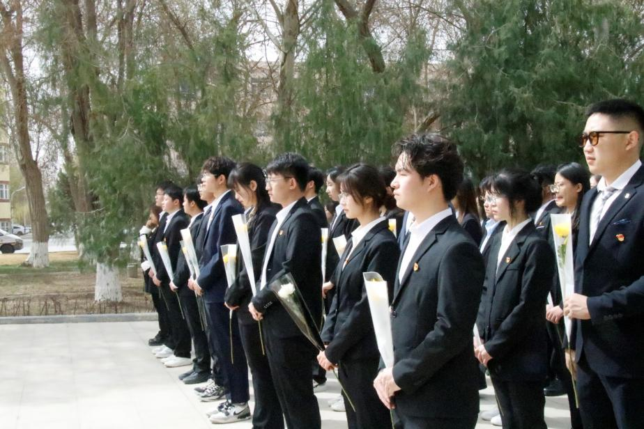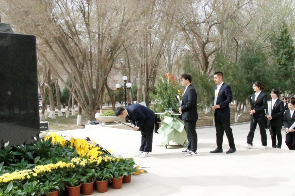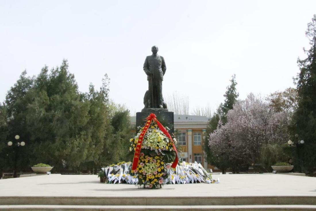 全体师生依次向王震将军雕像鞠躬,献上鲜花,缅怀先烈的丰功伟绩和崇高精神,表达深切悼念和无限敬仰。