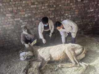 针对已经腹泻两个月,什么抗生素都用遍了的一只2岁的雄性马鹿,申教授亲自观察了马鹿的饲料和粪便,提出停用现在的抗生素,改为调整饲粮和补充益生菌的建议;而另一只持续两天食欲下降、左前肢蹄部化脓的3岁雄性马鹿,申教授则果断建议吹麻后全身体检,抽血带回化验,重点检查有无破伤风感染的风险并药敏试验进行临床给药指导,外科高进东博士对蹄部消毒包扎。